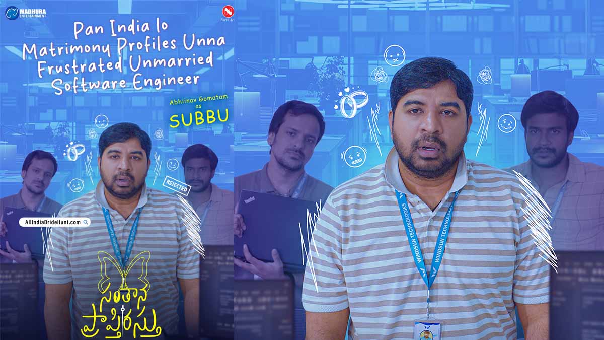 Today, the character poster of Abhinav Gomatam as the software engineer ‘Subbu’ from Santhana Prapthirasthu was released. In this film, Abhinav portrays Subbu, a frustrated, unmarried software engineer with pan-India matrimony profiles. His comedic portrayal of Subbu’s exasperation promises to provide plenty of laughs for the audience. Director Sanjeev Reddy is tackling a contemporary issue in an entertaining way, with Santhana Prapthirasthu generating much curiosity among the audience. The film is set to have a grand theatrical release soon.