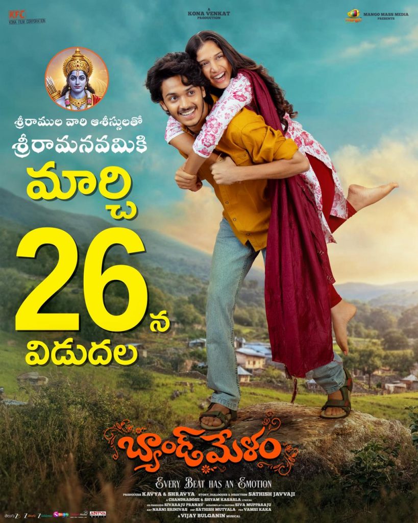 ‘బ్యాండ్ మేళం’ టీజర్, ట్రైలర్, మాస్ పెప్పీ సాంగ్ ‘తిప్పూ కుంటున్నావ్’, మంచి మెలోడీ సాంగ్ ‘పల్లెలోని సందల్లన్ని మీవే’ వంటివి ఆడియెన్స్లో సినిమా పట్ల అంచనాల్ని పెంచేసింది. యూత్ ఆడియెన్స్లో ఇప్పటికే మంచి బజ్ను క్రియేట్ చేసుకున్న ఈ చిత్రం శ్రీరాముడి ఆశీస్సులతో శ్రీరామ నవమి సందర్భంగా రిలీజ్ కాబోతోంది. మార్చి 26న ఈ సినిమాని గ్రాండ్గా రిలీజ్ చేసేందుకు మేకర్లు ప్లాన్ చేశారు.