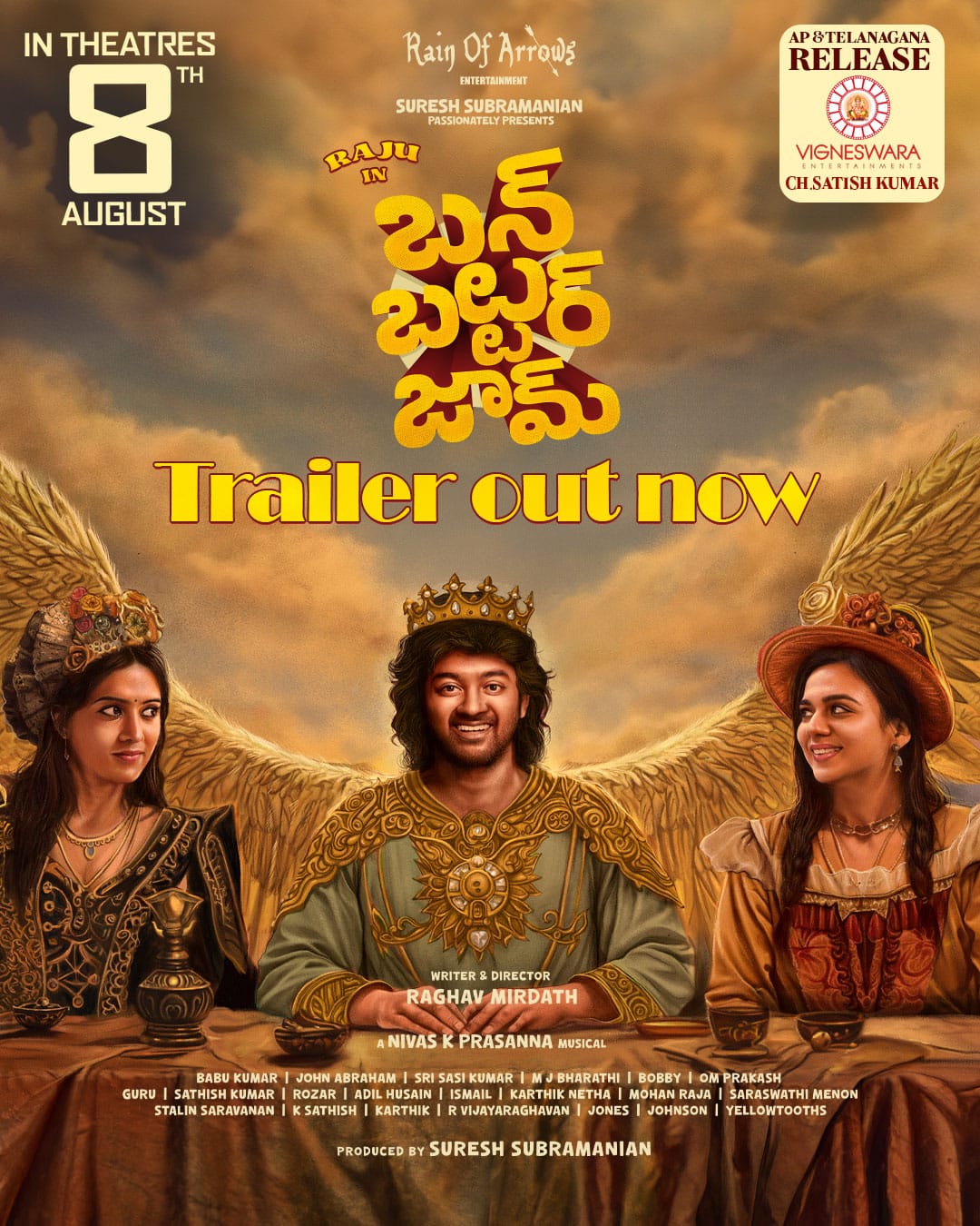 రాజు జెయమోహన్, ఆధ్య ప్రసాద్, భవ్య త్రిఖ హీరో హీరోయిన్లుగా రాఘవ్ మిర్దత్ దర్శకత్వంలో తెరకెక్కిన చిత్రం ‘బన్ బటర్ జామ్’. సురేష్ సుబ్రమణియన్ సమర్పకుడిగా రెయిన్ ఆఫ్ ఎరోస్, సురేష్ సుబ్రమణియన్ నిర్మించిన ఫన్ ఫ్యామిలీ ఎంటర్టైనర్ ‘బన్ బటర్ జామ్’ ఔట్ అండ్ ఔట్ కామెడీగా తమిళ్లో సూపర్ హిట్ అయ్యింది. ఈ మూవీని తెలుగులో ఆగస్టు 22న శ్రీ విఘ్నేశ్వర ఎంటైన్మెంట్స్ బ్యానర్ పైన సిహెచ్ సతీష్ కుమార్ గ్రాండ్ రిలీజ్ చేస్తున్నారు. ఈ క్రమంలో ట్రైలర్ను రిలీజ్ చేశారు.