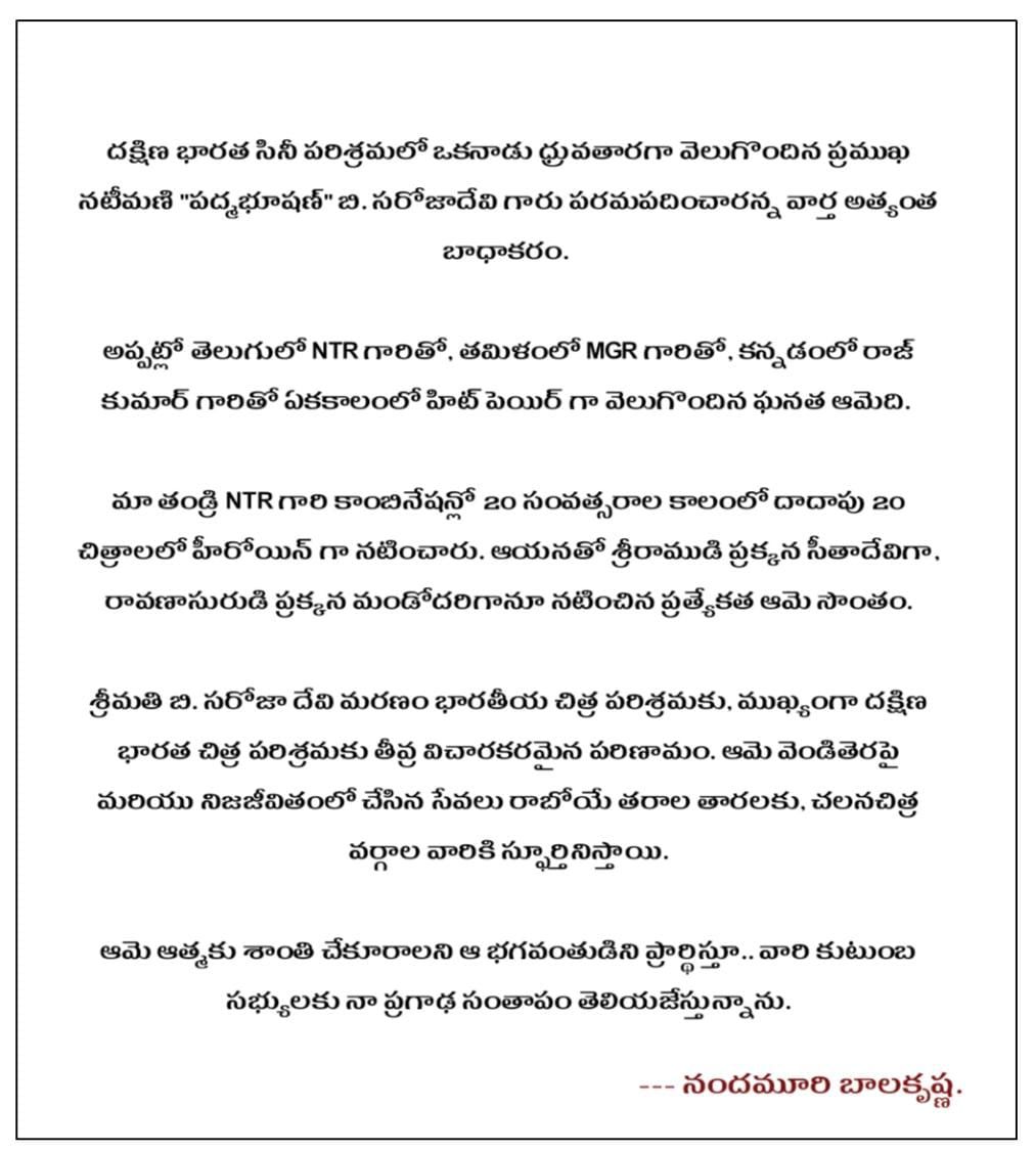 శ్రీమతి బి. సరోజా దేవి మరణం భారతీయ చిత్ర పరిశ్రమకు, ముఖ్యంగా దక్షిణ భారత చిత్ర పరిశ్రమకు తీవ్ర విచారకరమైన పరిణామం. ఆమె వెండితెరపై మరియు నిజజీవితంలో చేసిన సేవలు రాబోయే తరాల తారలకు, చలనచిత్ర వర్గాల వారికి స్ఫూర్తినిస్తాయి.