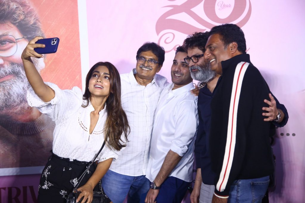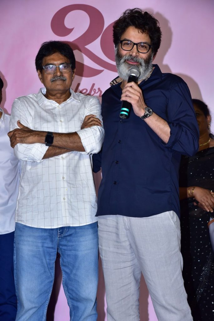 ‘నువ్వే నువ్వే’ కోసం ఢిల్లీకి వెళ్లి శ్రియతో పాటు వాళ్ళ అమ్మకు కథ చెప్పడం నుంచి శ్రీనగర్ కాలనీలో రవికిశోర్ గారి ఆఫీసులో అందరికీ స్క్రిప్ట్ రీడింగ్ ఇవ్వడం నుంచి ప్రకాశ్ రాజ్ గారి ఇంటికి వెళ్లడం, ఊటీలో షూటింగ్ చేయడం… ప్రతిదీ ఇప్పటికీ గుర్తు. ‘నువ్వే నువ్వే’ షూటింగ్లో ఫైట్ మాస్టర్ లేకపోతే తరుణ్ చేత ఒక కిక్ కొట్టించే సీన్ చేశా. అప్పుడు నాలో వయలెన్స్ ఉందని అర్థమైంది. ‘అతడు’ తీసిన తర్వాత వెంకటేష్ గారు ‘నువ్వు చూస్తే సాఫ్ట్ గా ఉంటావ్. సినిమా వైలెంట్ గా తీశావ్’ అన్నారు. ఆ వయలెన్స్ ‘నువ్వే నువ్వే’లో కిక్ తో స్టార్ట్ అయ్యింది. నాలో ఉన్న రచయితను గానీ… దర్శకుడిని గానీ… నాకంటే ఎక్కువగా గుర్తించిన, ఇష్టపడ్డ వ్యక్తి రవికిశోర్ గారు. ఆయన్ను నేను చాలా ప్రేమిస్తా. గౌరవిస్తా. రవికిశోర్ గారు అనడమే వచ్చు. నాకు ఆయన అన్నలాగా! ఆయనకు, సీతారామశాస్త్రి గారి మధ్య ఉన్న లవ్ అండ్ హేట్ రిలేషన్షిప్ ఇంకెవరి మధ్య చూడలేదు. అందుకు నేను సాక్షిని. ‘గాలిపటం గగనానిదా? ఎగరేసే నేలదా?’ అని రాసిన శాస్త్రి గారి గురించి నేను ఏం చెప్పగలను! ఆయన మాటల్లో చెప్పాలంటే… ‘ఆయన ఉఛ్వాసం కవనం. ఆయన నిశ్వాసం గానం. ఆయన జ్ఞాపకం మన అందరికీ ఎప్పటికీ అమరం’. అటువంటి సీతారామశాస్త్రి గారి దివ్య స్మృతికి ఆయన పాదాల దగ్గర ఈ సినిమాను రవికిశోర్ గారు, నేను, మా చిత్ర బృందం నివాళిగా అర్పిస్తున్నాం” అని అన్నారు. దర్శకుడిగా తనను పరిచయం చేసిన ‘స్రవంతి’ రవికిశోర్ పాదాలకు త్రివిక్రమ్ నమస్కరించారు.