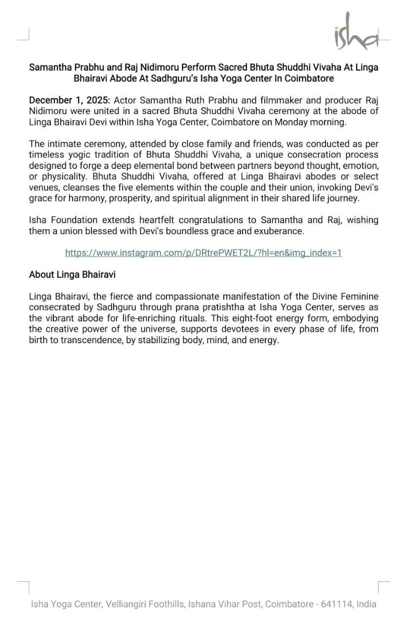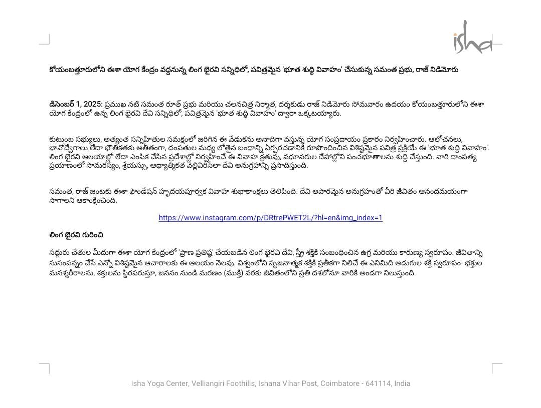 ప్రముఖ నటి సమంత రూత్ ప్రభు మరియు చలనచిత్ర నిర్మాత, దర్శకుడు రాజ్ నిడిమోరు సోమవారం ఉదయం కోయంబత్తూరులోని ఈశా యోగ కేంద్రంలో ఉన్న లింగ భైరవి దేవి సన్నిధిలో, పవిత్రమైన ‘భూత శుద్ధి వివాహం’ ద్వారా ఒక్కటయ్యారు.