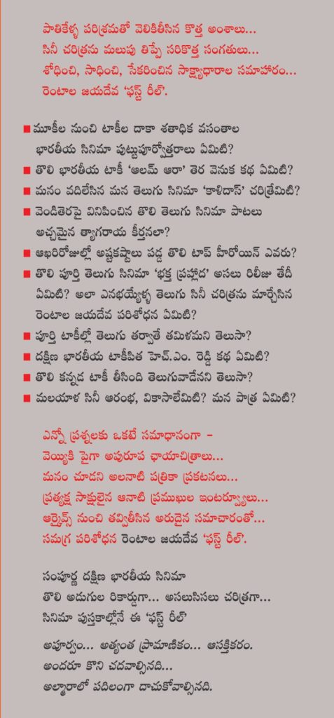 హిందీతో సహా తెలుగు, తమిళ, కన్నడ, మలయాళ సినీసీమల్లో వచ్చిన తొట్టతొలి టాకీలకు సంబంధించిన అనేక చారిత్రక సత్యాలను ఈ రచనలో జయదేవ అందించారు. అత్యంత అరుదైన దాదాపు 2 వేల పత్రికా ప్రకటనలు, ఫోటోలను ఈ పుస్తకంలో పొందుపరిచారు. 90 ఏళ్ళ చరిత్ర గల ప్రతిష్ఠాత్మక పుస్తక ప్రచురణ సంస్థ ‘ఎమెస్కో’ 566 పేజీల ఈ బృహత్ రచనను ప్రచురించింది. ఇది పండిత, పామరుల ప్రశంసలందుకొని, ప్రామాణిక చరిత్ర గ్రంథంగా పాఠక లోకంలో గుర్తింపు తెచ్చుకుంది. అదిగో… ఈ రచనకే ఇప్పుడు తెలంగాణ రాష్ట్ర ప్రభుత్వం 2024వ సంవత్సరానికి గాను ‘ఉత్తమ సినీ గ్రంథం’గా ప్రతిష్ఠాత్మక గద్దర్ తెలంగాణ ఫిల్మ్ అవార్డును ప్రకటించింది.