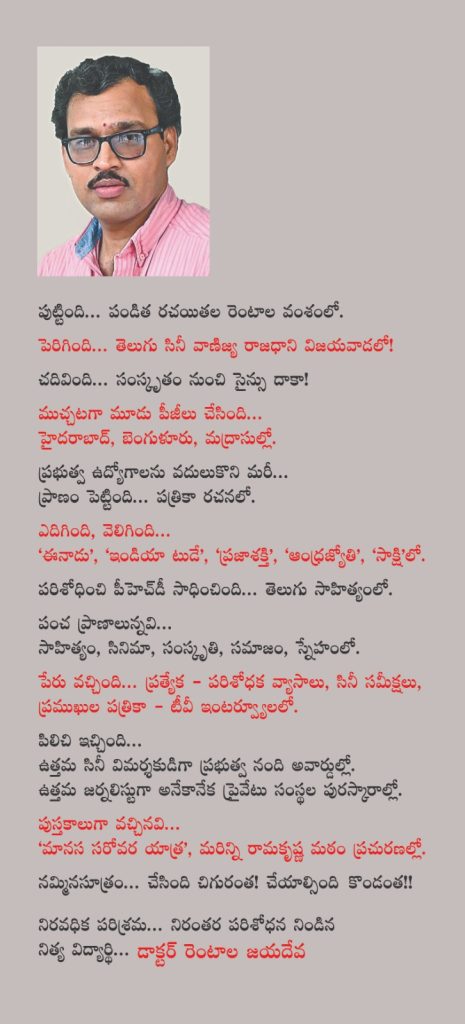 తెలుగునాట రచయితగా, పరిశోధకుడిగా, పత్రికా రంగంలో ఫీచర్స్ రచయితగా, సినీ విశ్లేషకుడిగా, విలేఖరిగా ప్రసిద్ధమైన పేరు – డాక్టర్ రెంటాల జయదేవ. ఇప్పటికి మూడున్నర దశాబ్దాల పైగా నిరంతరాయంగా ఆయన తన రచనలతో ప్రత్యేక కృషి చేస్తున్నారు. తండ్రి గారైన ప్రముఖ అభ్యుదయ కవి, దాదాపు 200 పుస్తకాలు రాసిన గ్రంథకర్త, జర్నలిస్టు, కీర్తిశేషులు రెంటాల గోపాలకృష్ణ గారి సాహితీ, పత్రికా వారసత్వాన్ని జయదేవ పుణికిపుచ్చుకున్నారు. పాత తరం పత్రికా విలువల జెండాను కొత్త తరంలో ముందుకు తీసుకువెళుతున్న అతి కొద్దిమంది నిఖార్సయిన జర్నలిస్టుల్లో ఒకరిగా నిలిచారు. జయదేవ పత్రికా సంపాదకీయాలు, ప్రత్యేక వ్యాసాలు, సినిమా సమీక్షలు, ప్రత్యేక వార్తా కథనాలు, విశ్లేషణలు, ప్రముఖులతో లోతైన టీవీ, పత్రికా ఇంటర్వ్యూలు ప్రజలకూ, పరిశ్రమ వారికీ సుపరిచితం. ఆపకుండా చదివించే ఆయన రచనలు పాఠకుల్ని ఆకట్టుకోవడమే కాక, పలుమార్లు చర్చనీయాంశం అవుతుంటాయి.