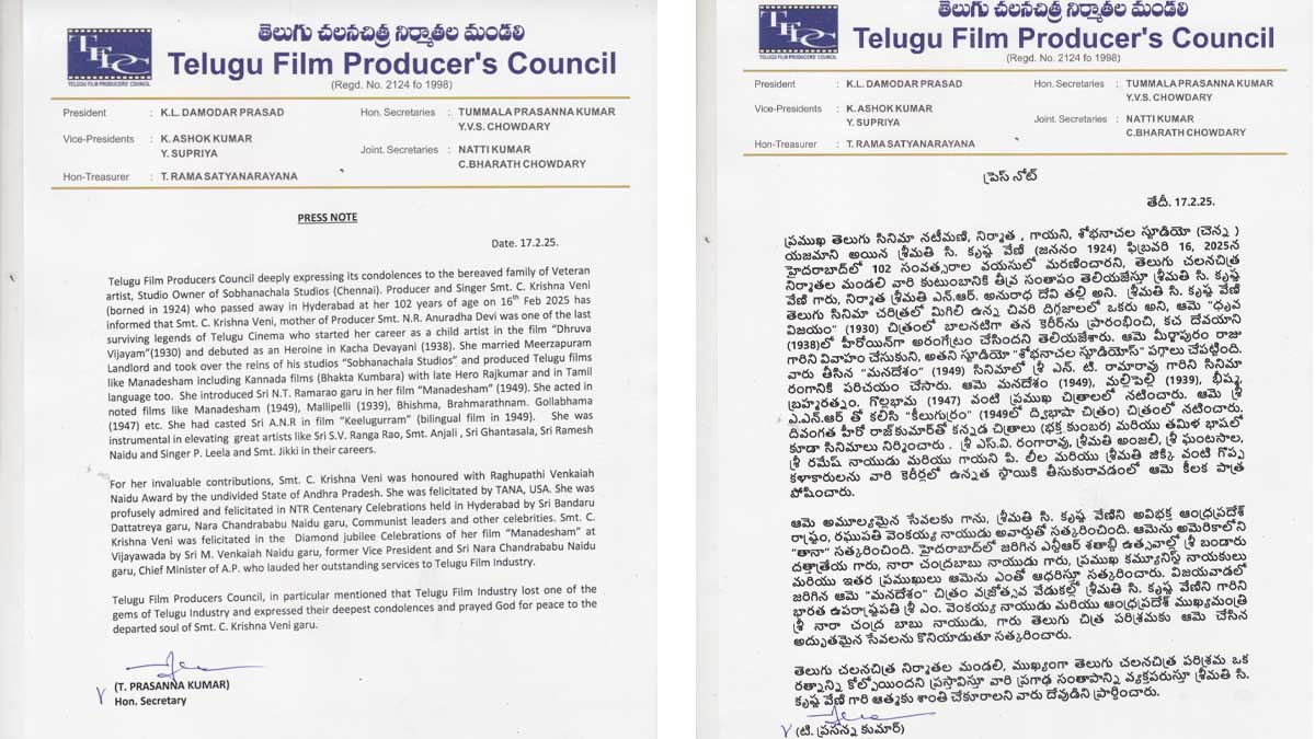 ప్రముఖ తెలుగు సినిమా నటీమణి, నిర్మాత , గాయని, శోభనాచల స్టూడియో (చెన్న ) యజమాని అయిన శ్రీమతి సి. కృష్ణ వేణి (జననం 1924) ఫిబ్రవరి 16, 2025న హైదరాబాద్లో 102 సంవత్సరాల వయసులో మరణించారని, తెలుగు చలనచిత్ర నిర్మాతల మండలి వారి కుటుంబానికి తీవ్ర సంతాపం తెలియజేస్తూ శ్రీమతి సి. కృష్ణ వేణి గారు, నిర్మాత శ్రీమతి ఎన్.ఆర్. అనురాధ దేవి తల్లి అని. శ్రీమతి సి. కృష్ణ వేణి తెలుగు సినిమా చరిత్రలో మిగిలి ఉన్న చివరి దిగ్గజాలలో ఒకరు అని, ఆమె “ధృవ విజయం” (1930) చిత్రంలో బాలనటిగా తన కెరీర్ను ప్రారంభించి, కచ దేవయాని (1938)లో హీరోయిన్గా అరంగేట్రం చేసిందని తెలియజేశారు. ఆమె మీర్జాపురం రాజు గారిని వివాహం చేసుకుని, అతని స్టూడియో “శోభనాచల స్టూడియోస్” పగ్గాలు చేపట్టింది. వారు తీసిన “మనదేశం” (1949) సినిమాలో శ్రీ ఎన్. టి. రామారావు గారిని సినిమా రంగానికి పరిచయం చేసారు. ఆమె మనదేశం (1949), మల్లిపెల్లి (1939), భీష్మ, బ్రహ్మరత్నం. గొల్లభామ (1947) వంటి ప్రముఖ చిత్రాలలో నటించారు. ఆమె శ్రీ ఎ.ఎన్.ఆర్ తో కలిసి “కీలుగుర్రం” (1949లో ద్విభాషా చిత్రం) చిత్రంలో నటించారు. దివంగత హీరో రాజ్కుమార్తో కన్నడ చిత్రాలు (భక్త కుంబర) మరియు తమిళ భాషలో కూడా సినిమాలు నిర్మించారు . శ్రీ ఎస్.వి. రంగారావు, శ్రీమతి అంజలి, శ్రీ ఘంటసాల, శ్రీ రమేష్ నాయుడు మరియు గాయని పి. లీల మరియు శ్రీమతి జిక్కి వంటి గొప్ప కళాకారులను వారి కెరీర్లలో ఉన్నత స్థాయికి తీసుకురావడంలో ఆమె కీలక పాత్ర పోషించారు.