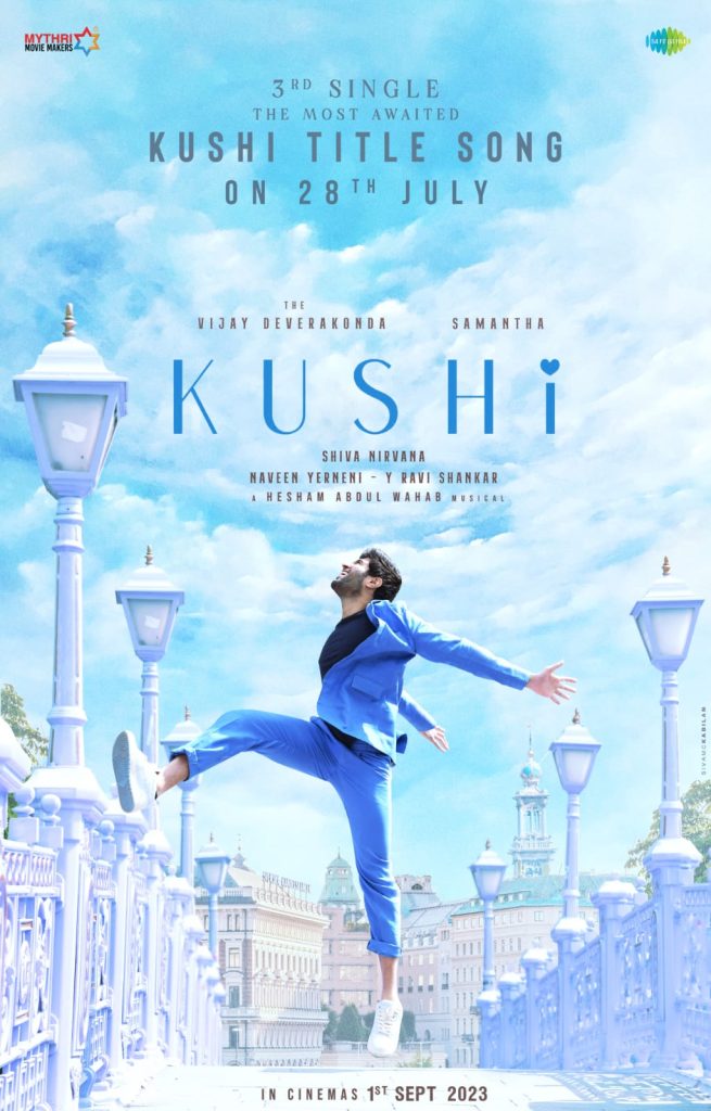 ఈ టైటిల్ సాంగ్ అప్డేట్ ఇస్తూ రిలీజ్ చేసిన పోస్టర్ ఇప్పుడు అందరినీ ఆకట్టుకుంటోంది. ప్రేమలో మునిగినట్టు.. అలా గాల్లో తేలిపోతోన్న విజయ్ దేవరకొండ పోస్టర్ ఎంతో కూల్గా ఉంది. ఇక ఖుషి టైటిల్ సాంగ్ కోసం శ్రోతలు ఎంతగానో ఎదురుచూస్తున్న సంగతి తెలిసిందే. జూలై 28న ఖుషి టైటిల్ సాంగ్ మరోసారి సోషల్ మీడియాను షేక్ చేయనుంది.