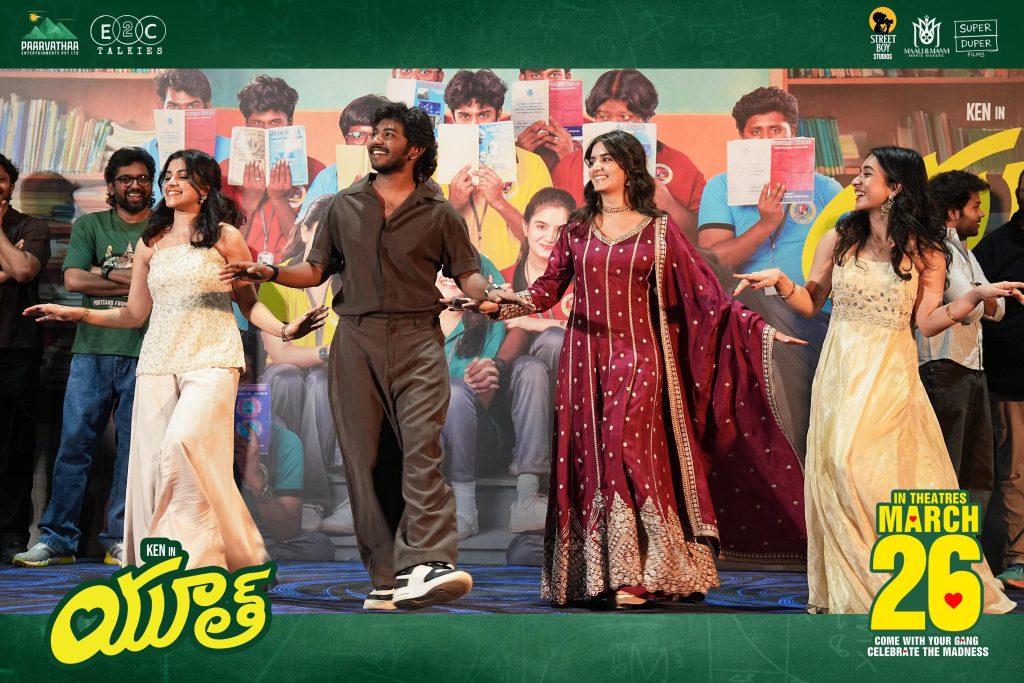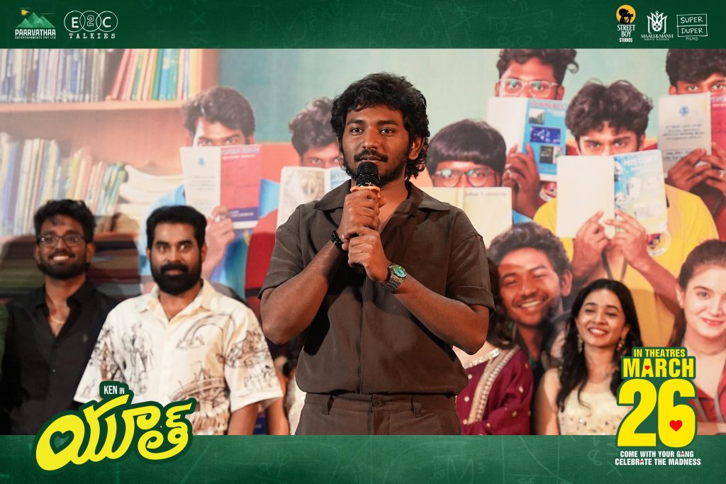కెన్ కరునాస్, అనిష్మ అనిల్ కుమార్, దేవదర్శిని చేతన్, సూరజ్ వెంజరముడు, ప్రియాన్షి యాదవ్, మీనాక్షి దినేష్ ప్రధాన పాత్రల్లో నటిస్తున్న తమిళ మూవీ “యూత్”. ఈ చిత్రాన్ని ఇదే పేరుతో ఈ2సీ బ్యానర్ పై తెలుగు ప్రేక్షకుల ముందుకు తీసుకొస్తున్నారు హౌస్ ఫుల్ వినీత్, సందీప్. ఈ చిత్రానికి కెన్ కరునాస్ అండ్ గ్యాంగ్ దర్శకత్వం వహించారు. ఈ నెల 26న “యూత్” మూవీ తెలుగులో గ్రాండ్ థియేట్రికల్ రిలీజ్ కు రాబోతోంది. ‘కమ్ విత్ యువర్ గ్యాంగ్, నోట్ – నో ఏజ్ లిమిట్’ అనే స్లోగన్ తో ఈ సినిమా ప్రమోషనల్ క్యాంపెయిన్ చేస్తున్నారు. సోమవారం ఈ సినిమా ప్రెషర్స్ మీట్ కార్యక్రమం పలువురు సినీ ప్రముఖుల సమక్షంలో హైదరాబాద్ లో సందడిగా నిర్వహించారు. ఈ కార్యక్రమంలో